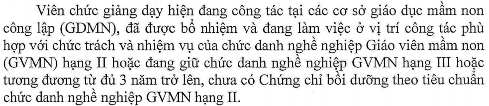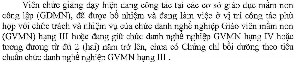 Giáo viên Mầm non, Tiểu học, THCS, THPT chưa có chứng chỉ bồi dưỡng theo tiêu chuẩn chức danh nghề nghiệp.