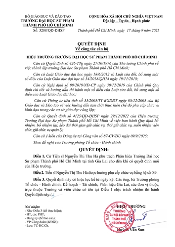 Quyết định về việc Cử Tiến sĩ Nguyễn Thị Thu Hà phụ trách Phân hiệu Trường Đại học Sư phạm Thành phố Hồ Chí Minh tại tỉnh Gia Lai.